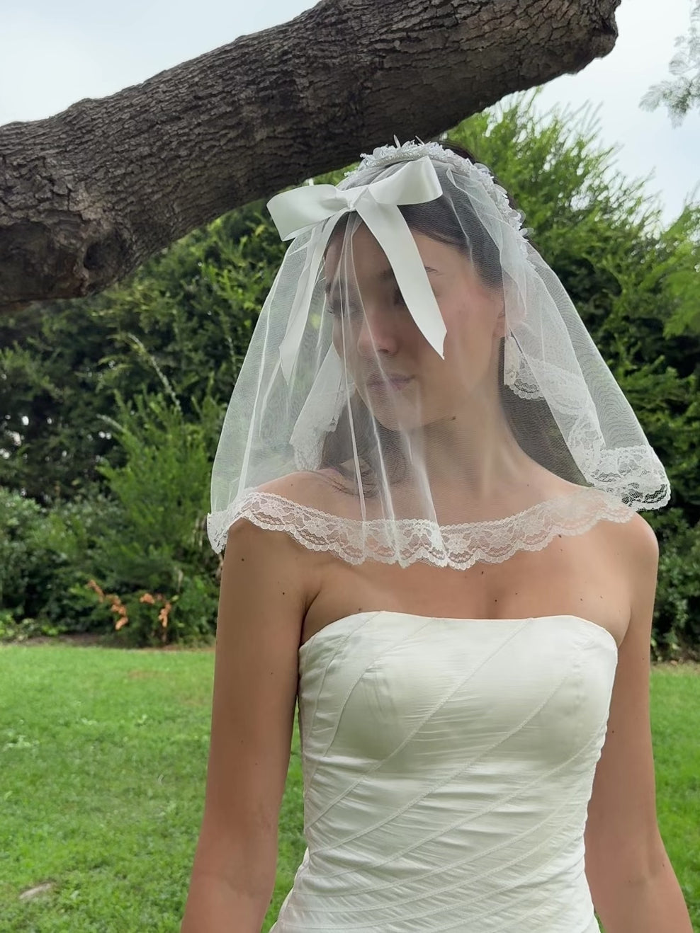 A vintage inspired short veil with lace trim and satin bow. The veil is attached to a headband so it can be worn in the front or in the back! A perfect bridal headpiece for a chic bride or fun bachelorette party.
